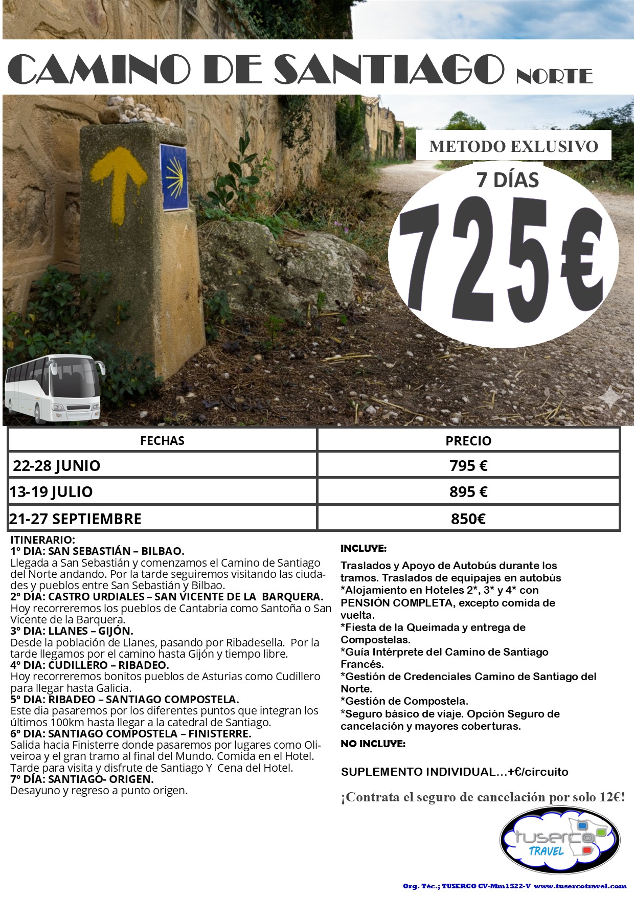Este viaje realiza el Camino de Santiago completo desde San Sebastián, pero se ha diseñado para evitar los tramos más peligrosos, arduos o dificultosos del camino. Así con el apoyo del Bus avanzamos y realizamos los diferentes tramos hasta llegar a Santiago. Por ello hemos seleccionado los tramos más bonitos y seguros. Siempre con las garantías que nos avalan desde hace muchos años realizando este maravilloso viaje recorreremos desde San Sebastián hasta Santiago 26 pueblecitos y 5 Ciudades capitales, además de unos rincones de Naturaleza muy bonitos.
