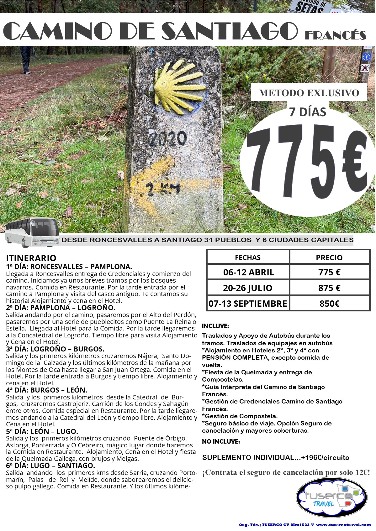 Este viaje realiza el Camino de Santiago completo desde Roncesvalles, combinando Naturaleza, Cultura y Gastronomía en un escenario mágico que te hará inolvidable esta experiencia. Se ha diseñado para evitar los tramos más peligrosos, arduos o dificultosos del camino. Así con el apoyo del Bus avanzamos y realizamos los diferentes tramos hasta llegar a Santiago. Por ello hemos seleccionado los tramos más bonitos y seguros. Siempre con las garantías que nos avalan desde hace muchos años realizando este maravilloso viaje recorreremos desde Roncesvalles hasta Santiago 31 pueblecitos y 6 Ciudades capitales.