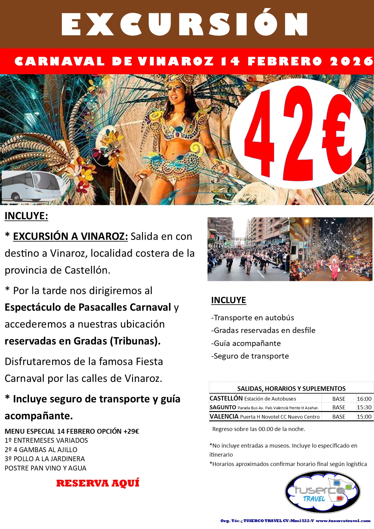 Vive el Carnaval de Vinaroz 2026 con una excursión cómoda, segura y perfectamente planificada. La salida será en autobús después de la comida, rumbo a Vinaroz, una encantadora localidad costera de la provincia de Castellón, reconocida por sus playas, su largo paseo marítimo y su deliciosa gastronomía, especialmente los famosos langostinos de Vinaroz.
