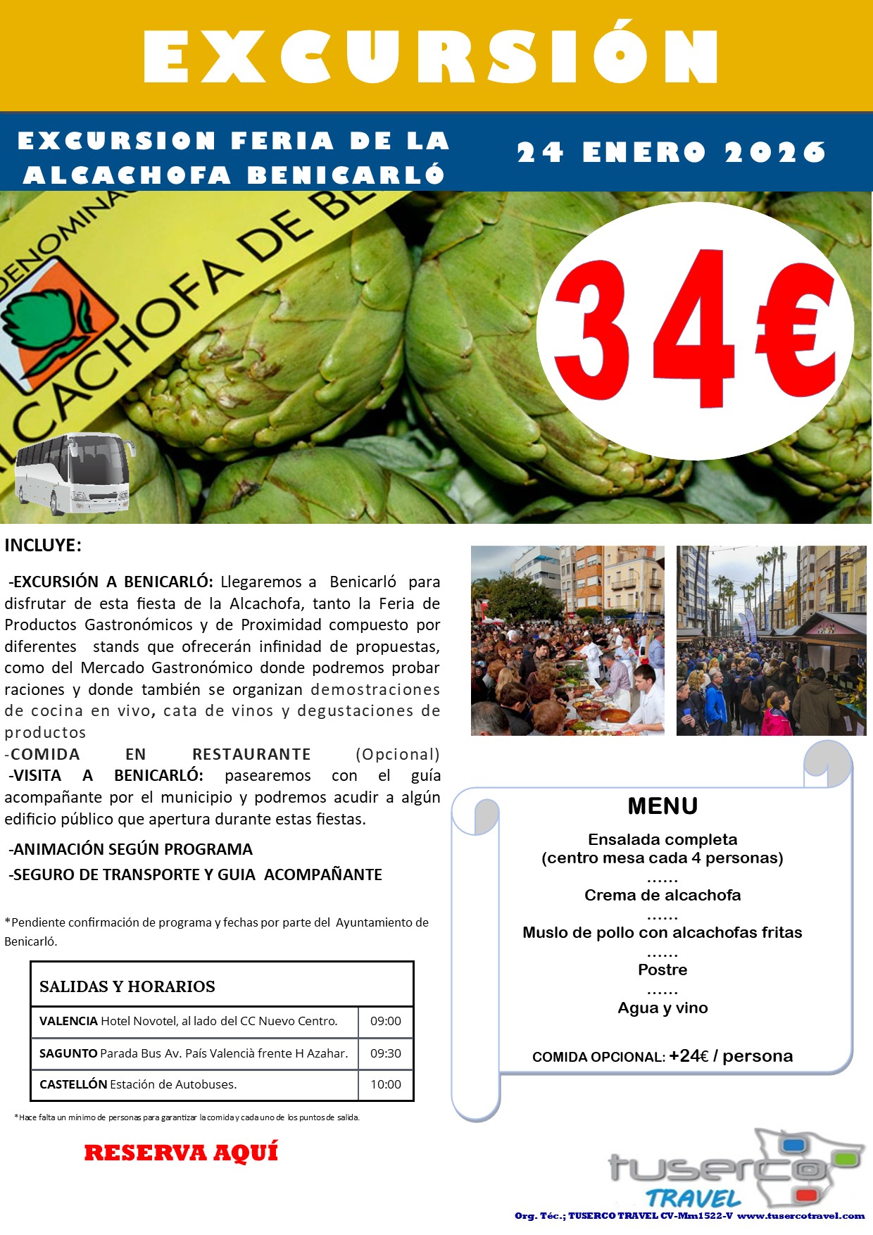-EXCURSIÓN A BENICARLÓ: Llegaremos a Benicarló para disfrutar de esta fiesta de la Alcachofa, tanto la Feria de Productos Gastronómicos y de Proximidad compuesto por diferentes stands que ofrecerán infinidad de propuestas, como del Mercado Gastronómico donde podremos probar raciones y donde también se organizan demostraciones de cocina en vivo, cata de vinos y degustaciones de productos