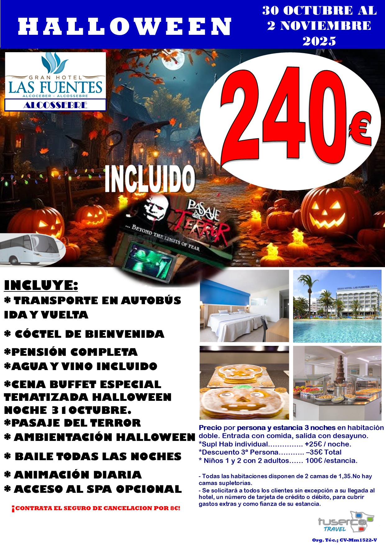 Disfruta de una escapada de miedo en el Gran Hotel Las Fuentes con cóctel de bienvenida, pensión completa, agua y vino incluidos, cena buffet especial de Halloween, animación diaria y baile cada noche.