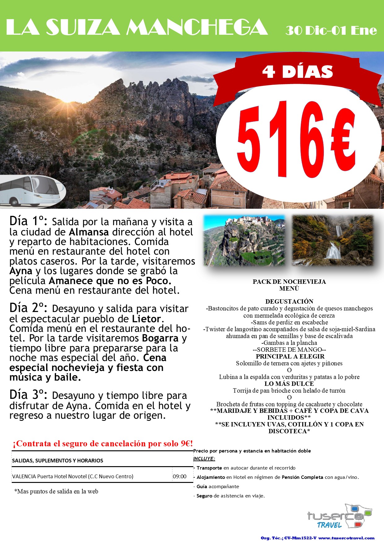 Día 2º: Desayuno y salida para visitar el espectacular pueblo de LIETOR Comida menú en el restaurante del hotel. Por la tarde visitaremos BOGARRA y tiempo libre para prepararse para la noche mas especial del año. Cena especial nochevieja y fiesta con música y baile.