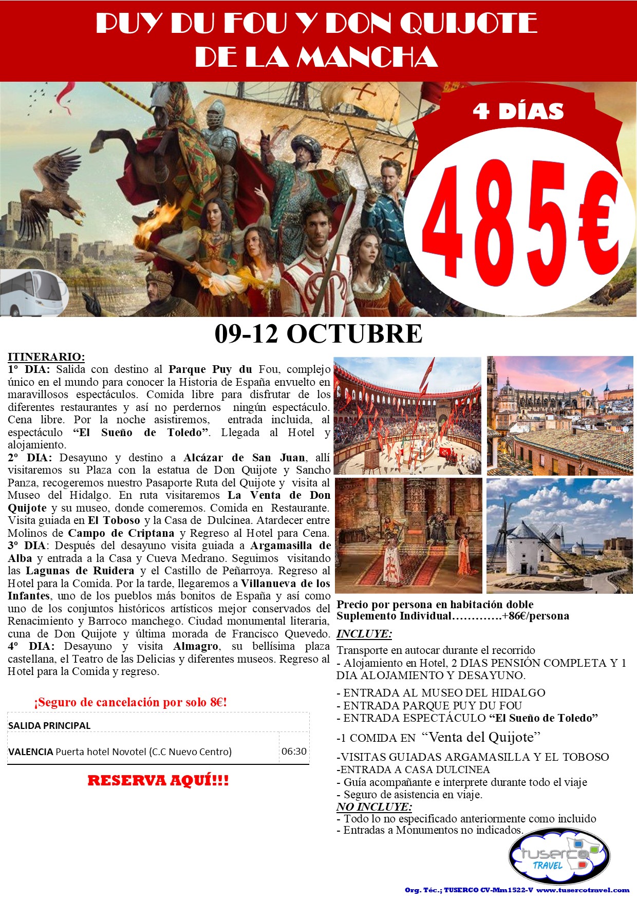 Un gran viaje para disfrutrar de Puy du Fou y Ruta Don Quijote. Un parque de día con un mundo espectacular para viajar a través de la Historia con grandiosos espectáculos, varios pueblos de época y un sin fin de rincones donde degustar productos gastronómicos del lugar. Disfruta de nuestra historia de un modo lleno de espectáculos y descubre el El Sueño de Toledo. También ven con nosotros a visitar los molinos de Consuegra y el museo del Quijote en la ciudad de Esquivias.