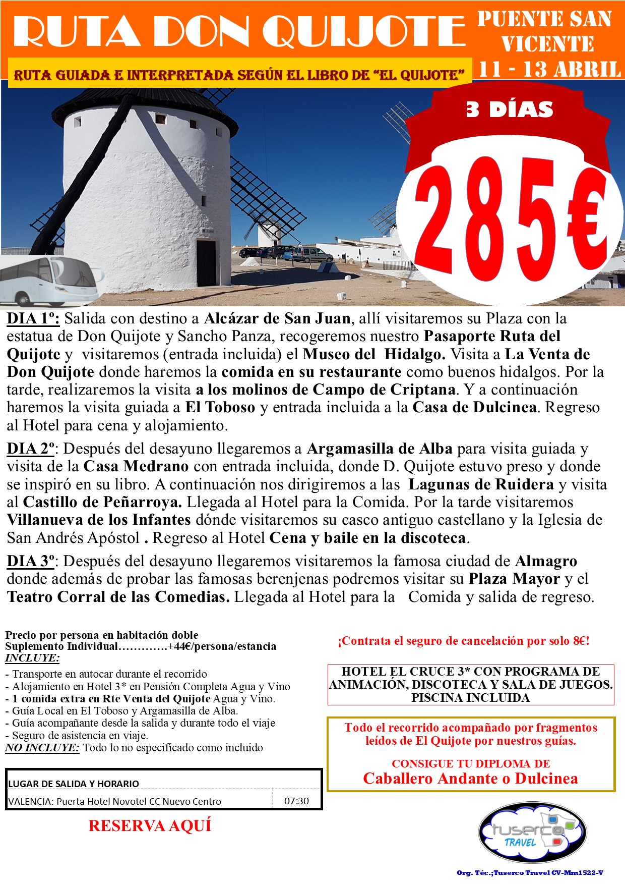 DIA 1º: Salida con destino a Alcázar de San Juan, allí visitaremos su Plaza con la estatua de Don Quijote y Sancho Panza, recogeremos nuestro Pasaporte Ruta del Quijote y visitaremos (entrada incluida) el Museo del Hidalgo. Visita a La Venta de Don Quijote donde haremos la comida en su restaurante como buenos hidalgos. Por la tarde, realizaremos la visita a los molinos de Campo de Criptana. Y a continuación haremos la visita guiada a El Toboso y entrada incluida a la Casa de Dulcinea. Regreso al Hotel para cena y alojamiento.