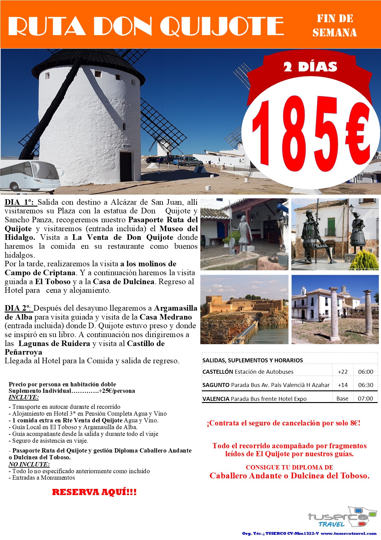 DIA 1º: Salida con destino a Alcázar de San Juan, allí visitaremos su Plaza con la estatua de Don   Quijote y    Sancho Panza, recogeremos nuestro Pasaporte Ruta del Quijote y visitaremos (entrada incluida) el Museo del     Hidalgo. Visita a La Venta de Don Quijote donde haremos la comida en su restaurante como buenos hidalgos. Por la tarde, realizaremos la visita a los molinos de   Campo de Criptana. Y a continuación haremos la visita guiada a El Toboso y a la Casa de Dulcinea. Regreso al Hotel para cena y alojamiento. DIA 2º: Después del desayuno llegaremos a Argamasilla de Alba para visita guiada y visita de la Casa Medrano (entrada incluida) donde D. Quijote estuvo preso y donde se inspiró en su libro. A continuación nos dirigiremos a las  Lagunas de Ruidera, visita al Castillo de Peñarroya. Llegada al Hotel para la Comida y salida de regreso. INCLUYE: – Transporte en autocar durante el recorrido – Alojamiento en Hotel 3* en Pensión Completa Agua y Vino – 1 comida extra en Rte Venta del Quijote Agua y Vino. – Guía Local en El Toboso y Argamasilla de Alba. – Guía acompañante desde la salida y durante todo el viaje – Seguro de asistencia en viaje. NO INCLUYE: – Todo lo no especificado anteriormente como incluido – Entradas a Monumentos Precio por persona en habitación doble Suplemento Individual………….+25€/persona ¡Contrata el seguro de cancelación por solo 8€!