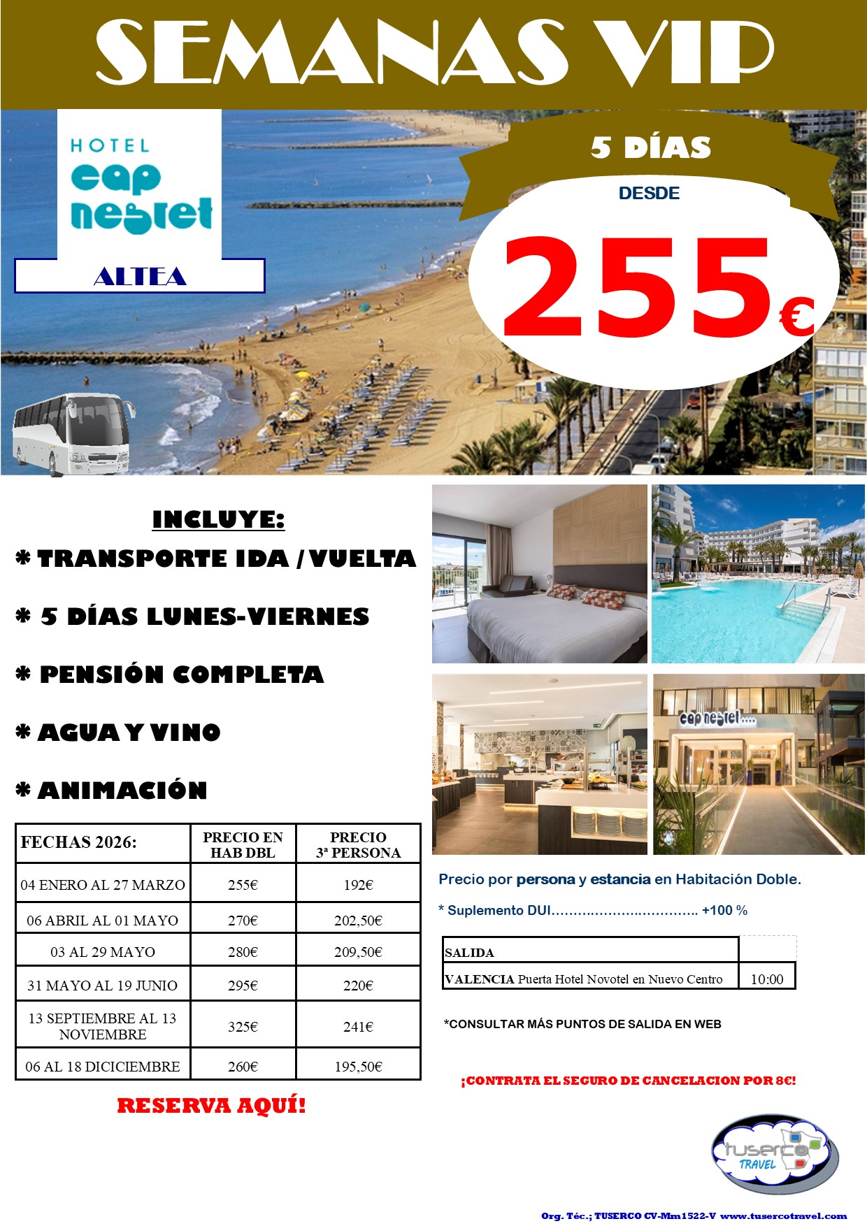 5 días/4 noches en habitación doble, con transporte desde Valencia (consultar otros puntos de recogida).